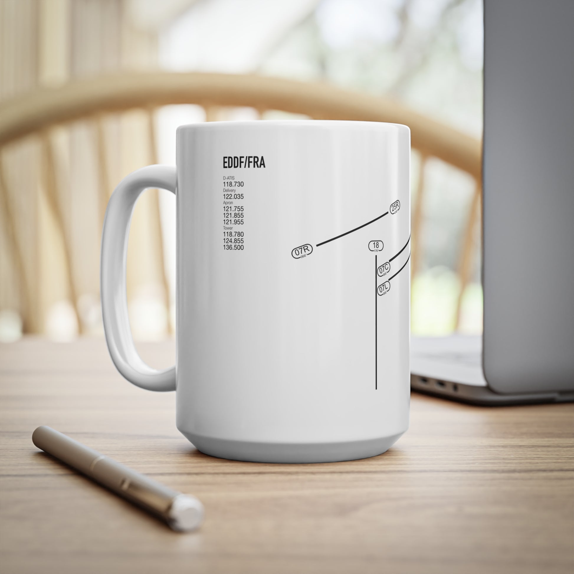 Elevate your workspace with this sleek white mug featuring a detailed schematic of Frankfurt Airport's runways (07L/C/R, 18, 25L/C/R). Perfect for aviation fans, pilots, or travelers who love FRA's layout. Made from durable, high-quality ceramic with a comfortable handle. Available in two sizes.