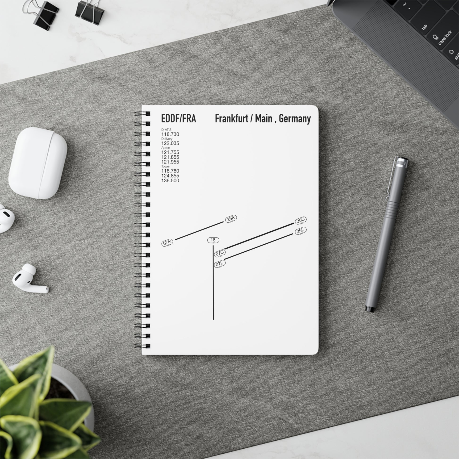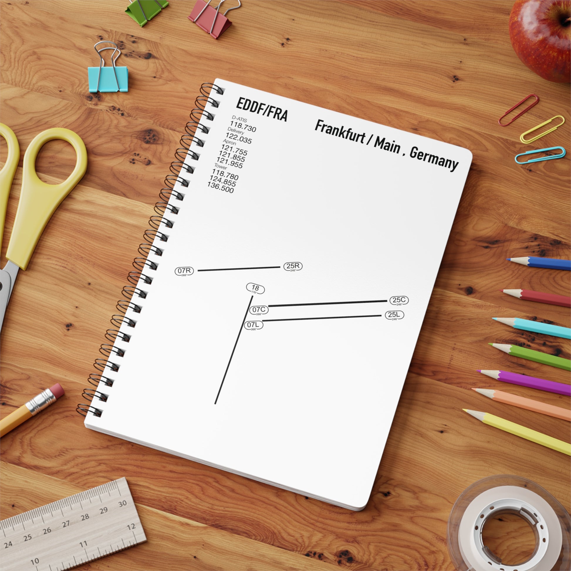 Elevate your note-taking experience with this sleek white notebook featuring a detailed schematic of Frankfurt Airport's runways (07L/C/R, 18, 25L/C/R). Perfect for aviation fans, pilots, or travelers who love FRA's layout. Made with premium paper and a sturdy cover, ideal for notes or sketches. Available in A5 size.