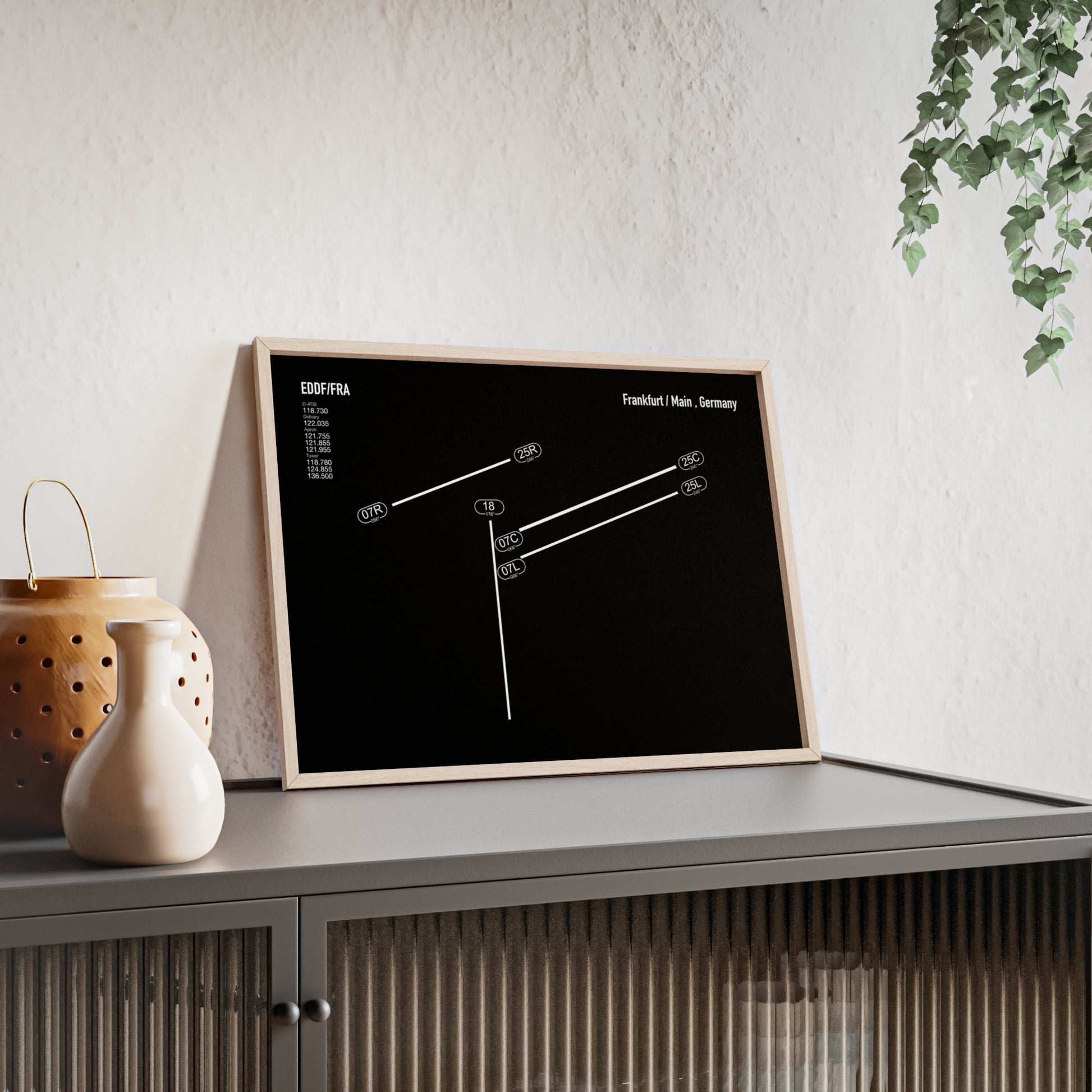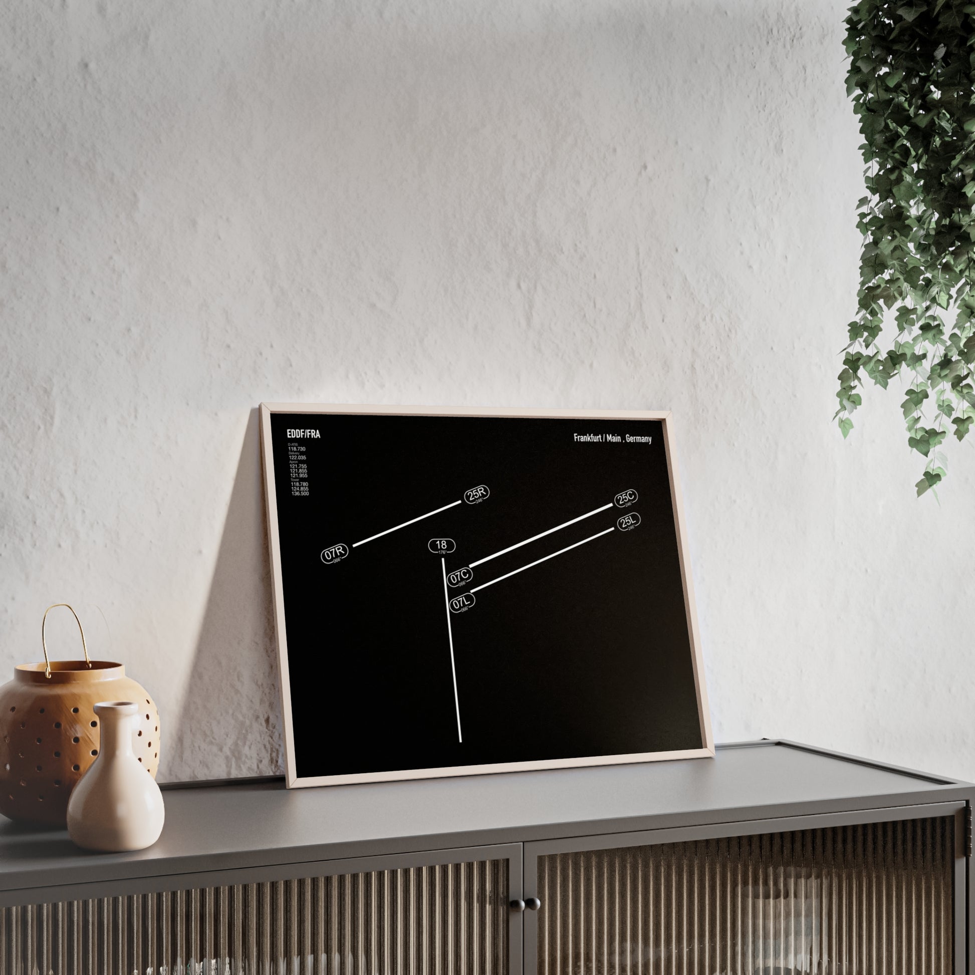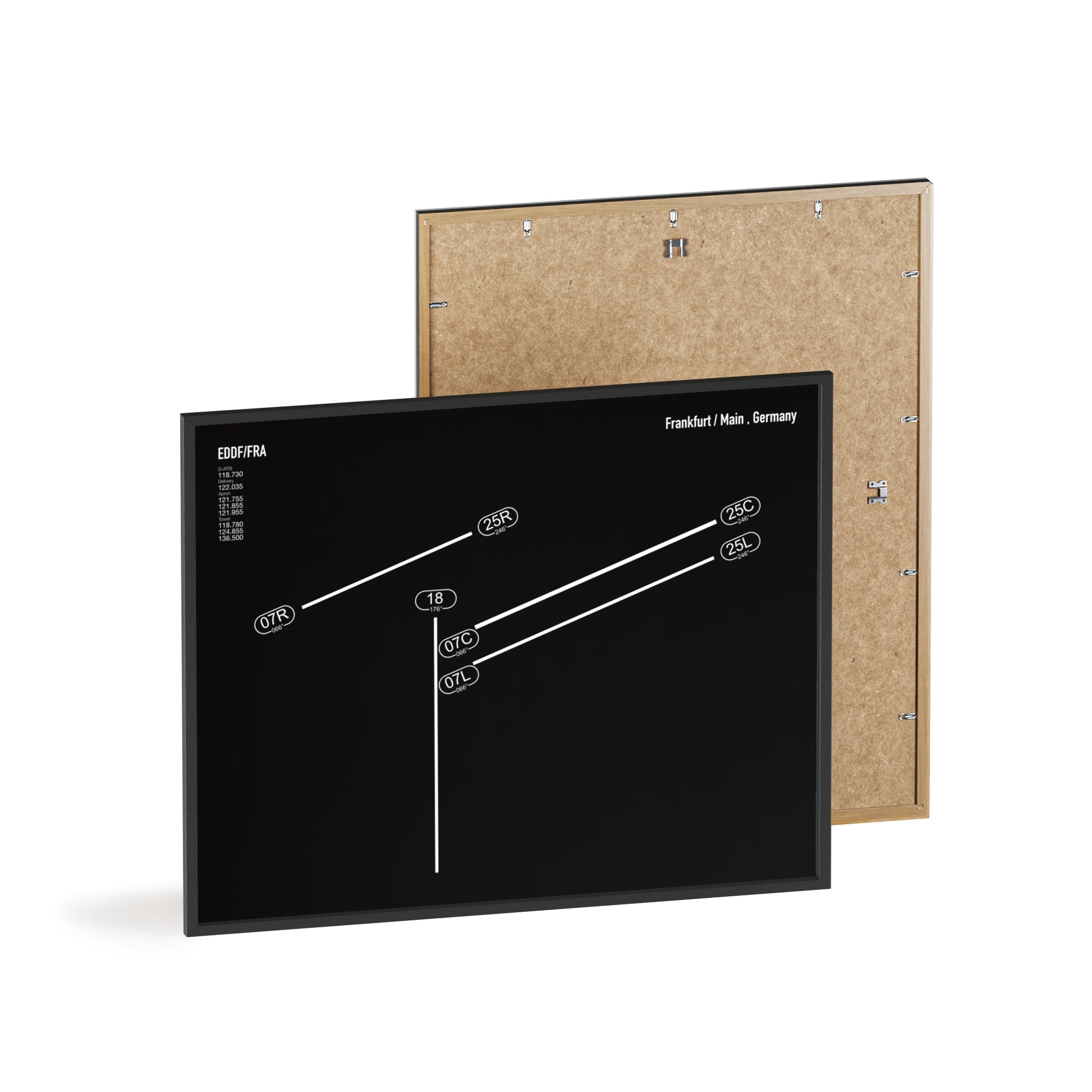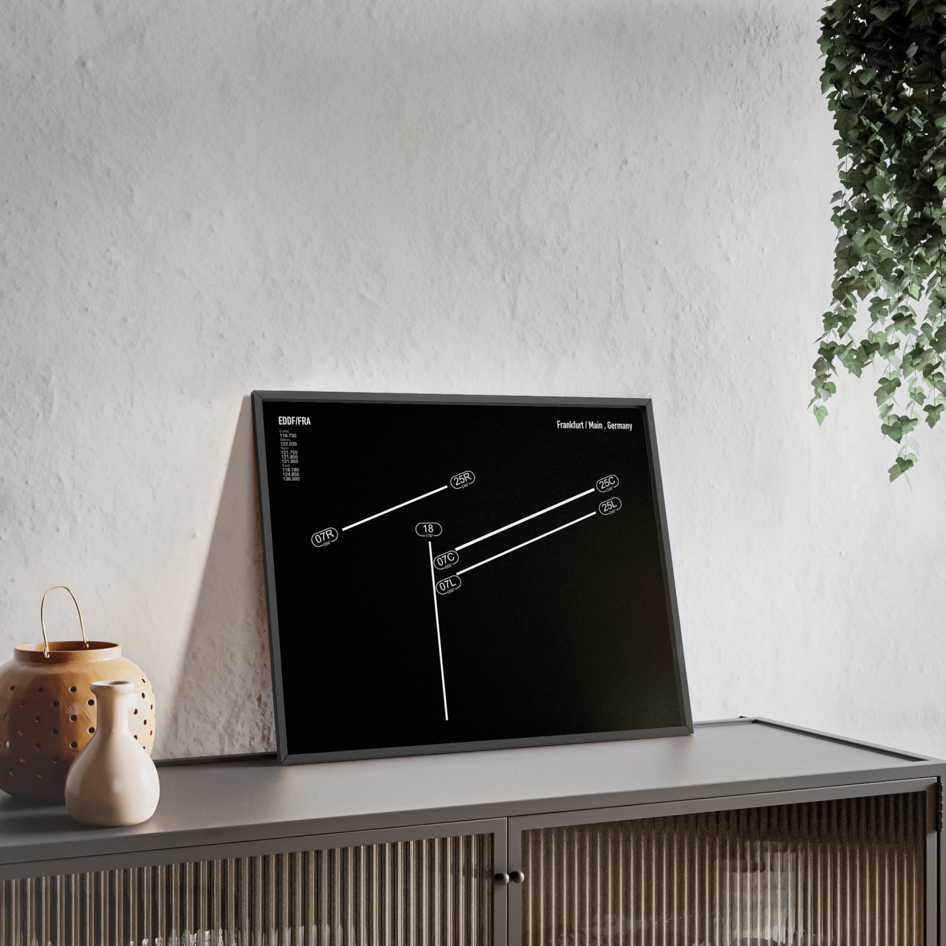 Transform your space with this sleek black poster featuring a detailed schematic of Frankfurt Airport's runways (07L/C/R, 18, 25L/C/R). Perfect for aviation fans, pilots, or travelers who love FRA's layout. Printed on high-quality paper with optional matching frame. Available in three horizontal sizes.