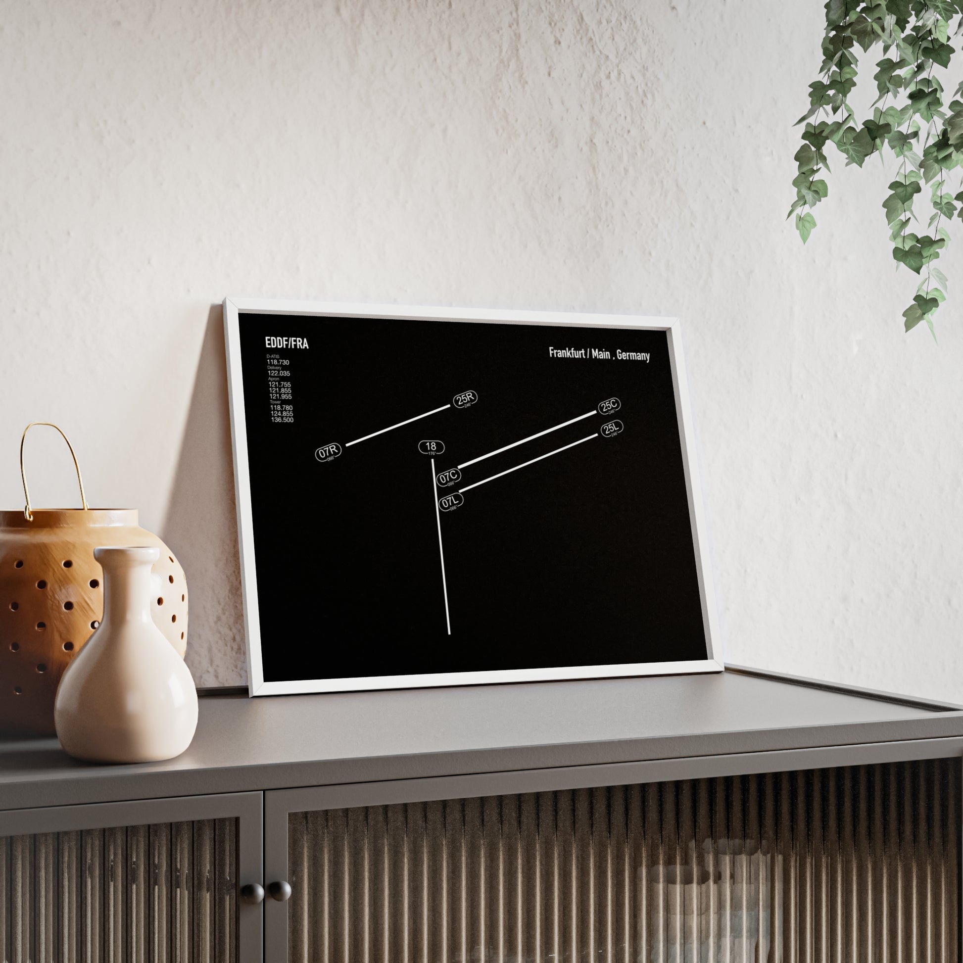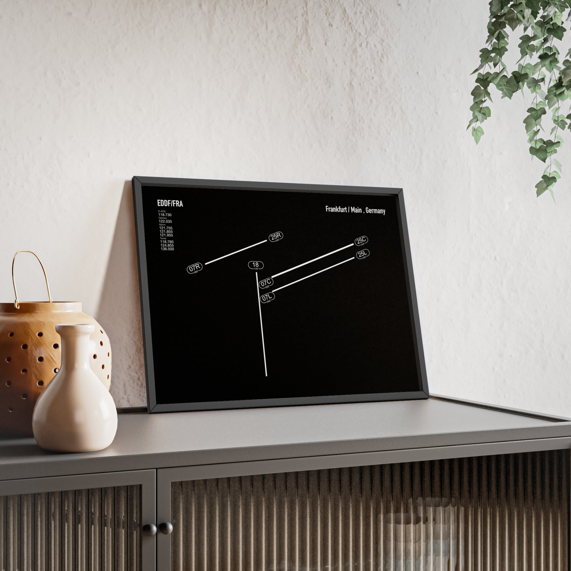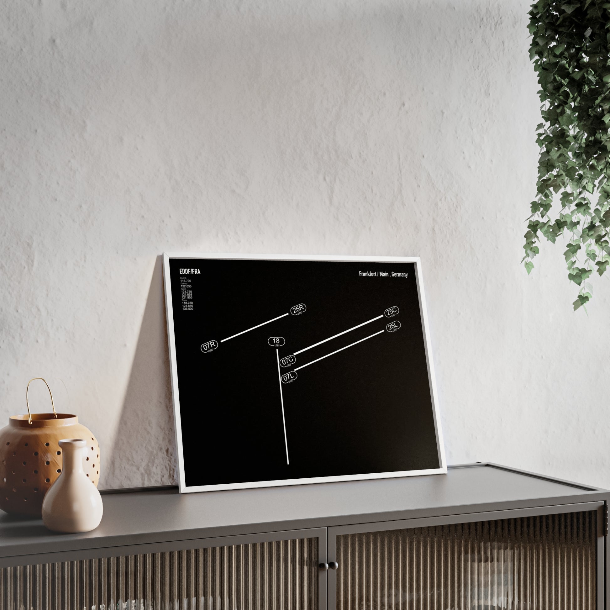 Transform your space with this sleek black poster featuring a detailed schematic of Frankfurt Airport's runways (07L/C/R, 18, 25L/C/R). Perfect for aviation fans, pilots, or travelers who love FRA's layout. Printed on high-quality paper with optional matching frame. Available in three horizontal sizes.