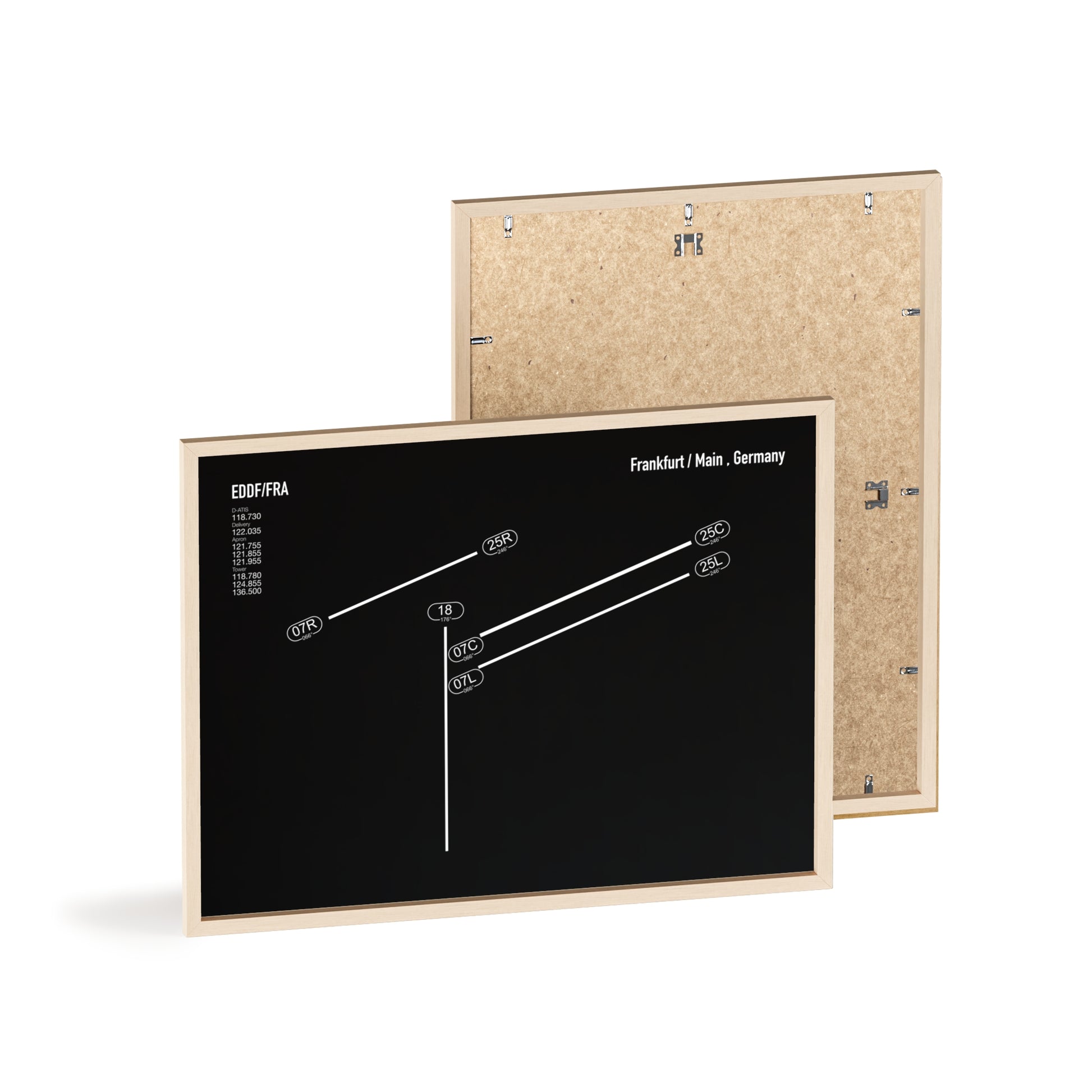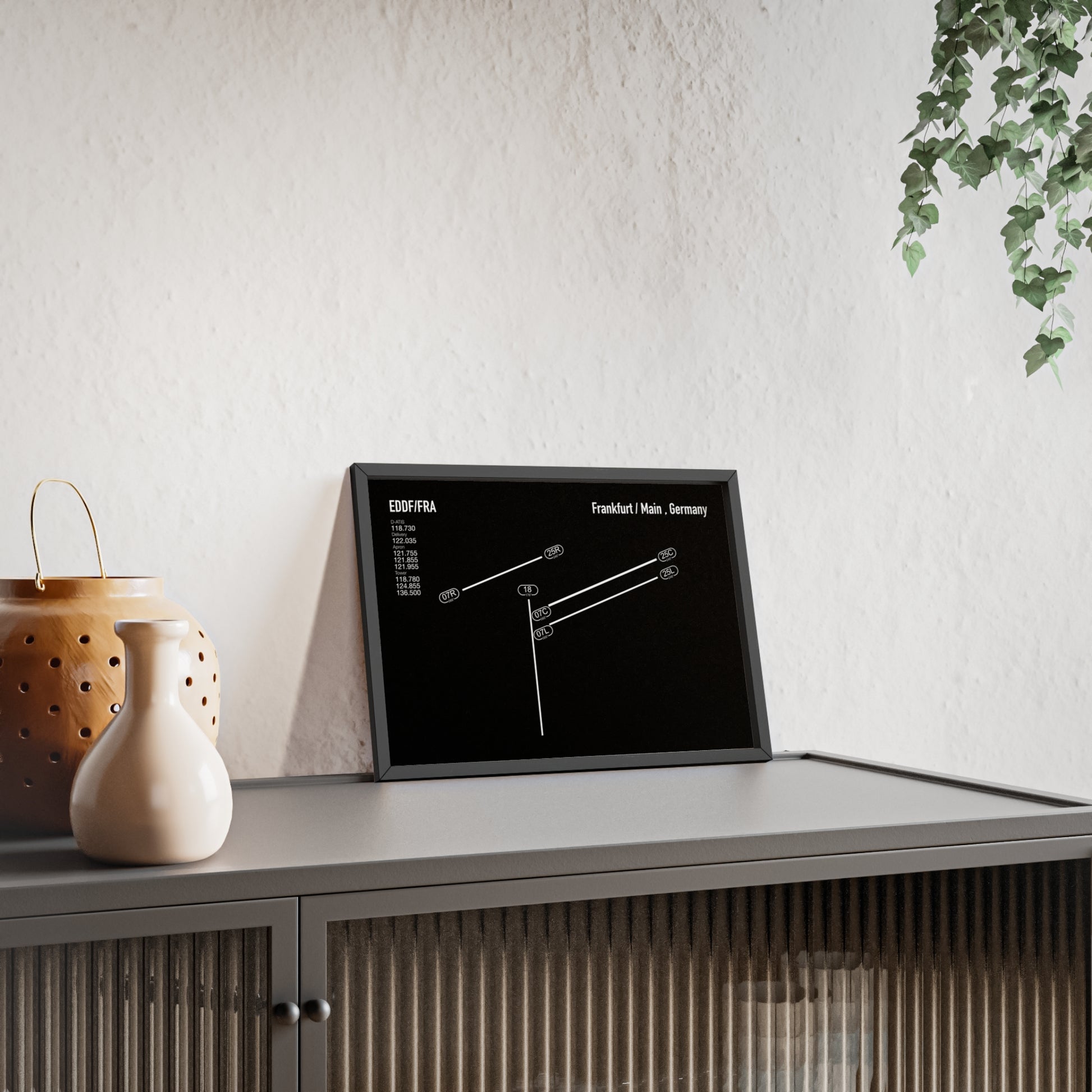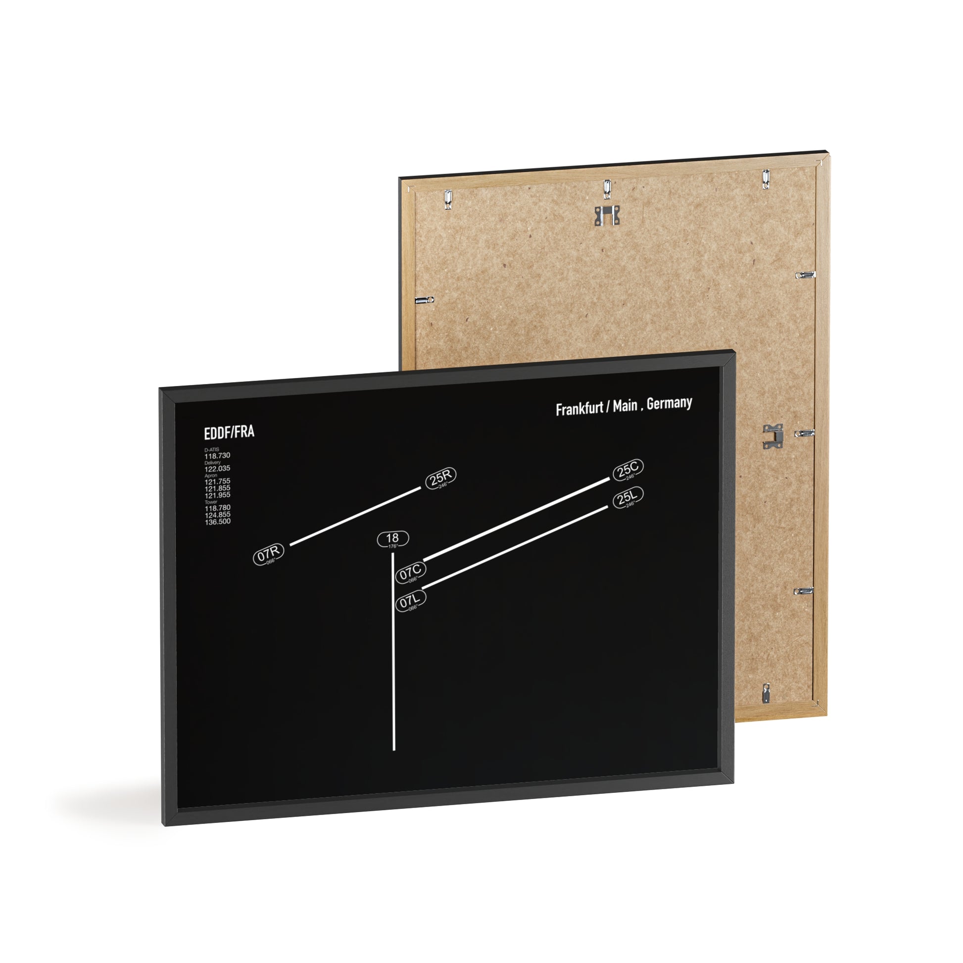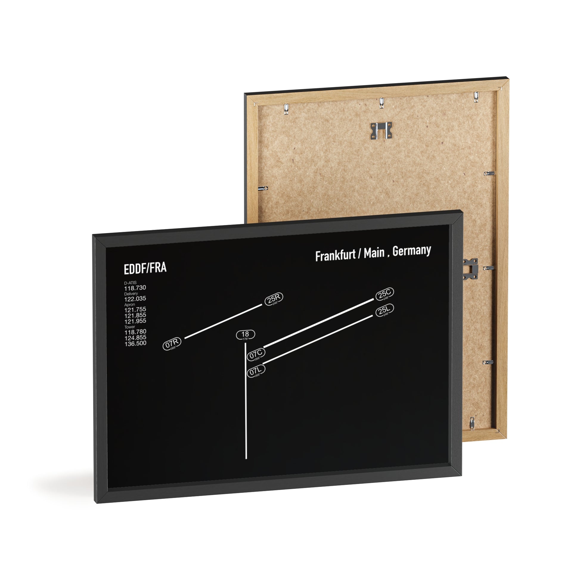 Transform your space with this sleek black poster featuring a detailed schematic of Frankfurt Airport's runways (07L/C/R, 18, 25L/C/R). Perfect for aviation fans, pilots, or travelers who love FRA's layout. Printed on high-quality paper with optional matching frame. Available in three horizontal sizes.